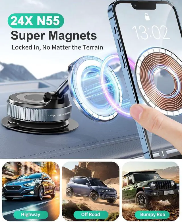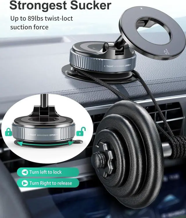 • [ Strong Suction with Manual Twist Enhancement ] This magnetic vacuum phone mount for magsafe with upgraded rotating lock vacuum suction and twist-lock mechanism, allowing for hands-free operation on various smooth surfaces.Just twist-lock mechanism and it will be sucked. The 4-layer high-strength nano gel suction cup supports up to 89lbs and holds firm in extreme temperatures (-40°F to 300°F). Perfect for video recording or taking photos. Even on bumpy roads or during sudden stop while using navigation, and the phone sta