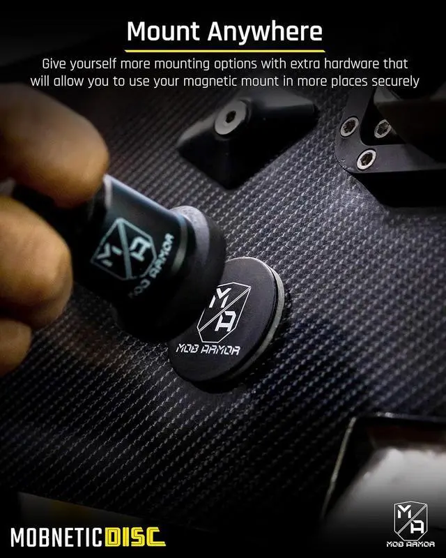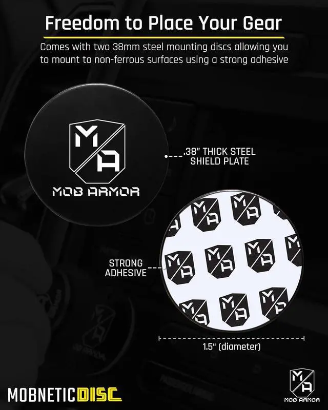 PERFECT SIZE & SHAPE: Absolutely a brand to flex! Mob Armor aims to keeps your smartphone accessible and secure. Use these round shape steel Mob Discs to expand the mounting options of your magnetic phone mounts. Mob Armor Mounting Discs are. 38mm thick/ 1.5 diameter and can fit just about anywhere that is flat.