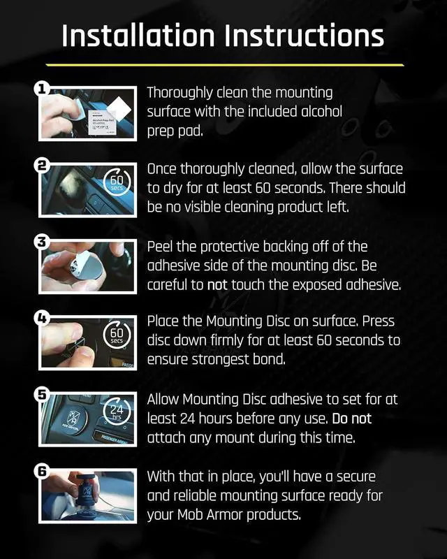 EASY AND SAFE TO INSTALL: The 3M VHB adhesive tape provides high stickiness to attach to a variety of metal structures and objects. To apply, clean the surface with alcohol wipes, hold Mob Disc firmly on the surface and let the adhesive set in. Secure your expensive electronics in endless locations for your comfort and convenience.
