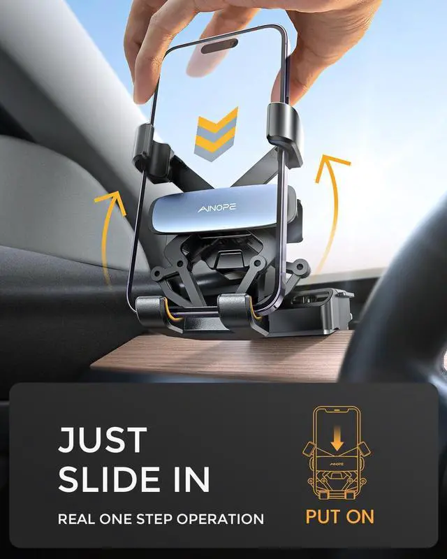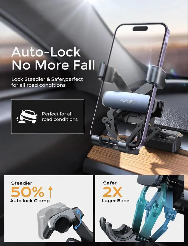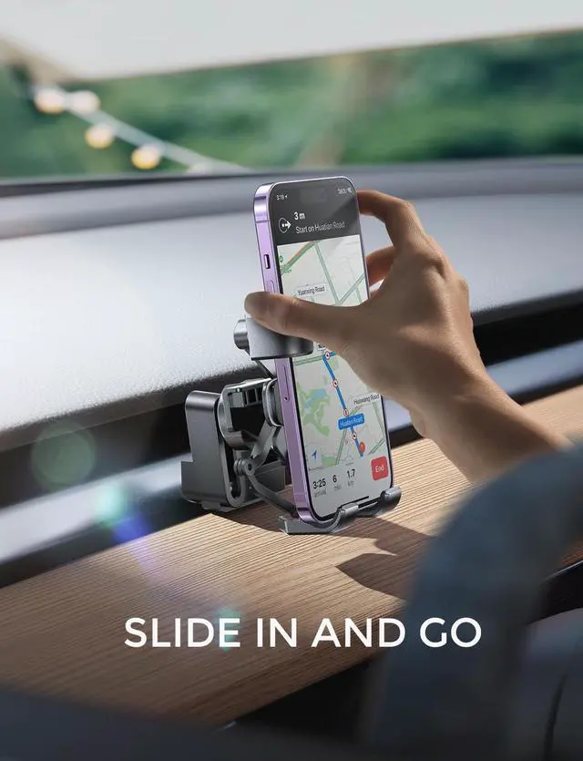 NO MORE FALL: This Tesla gravity slide-in phone mount creatively features the Auto-lock arm-slots that stretch on the side can auto adjust to hold phone more firmly without fears of bumps. Compared to manual lock version which being loose frequently, as its automatic rebound design you no need for secondary adjustment. Special curve of arms fit phone better. And the phone was all-round protected by silicone rubber on the inside clamps.