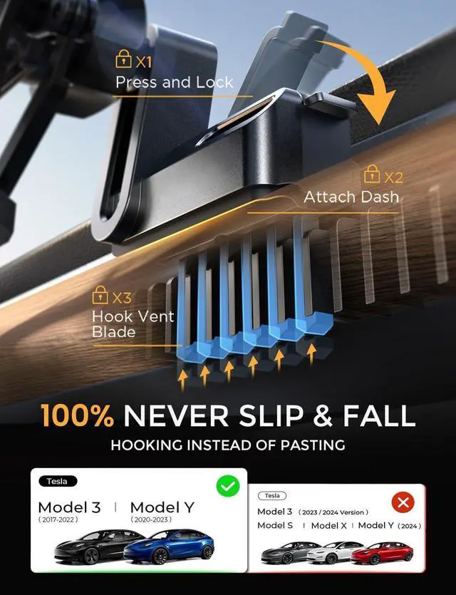 NOTE: Please note that this Tesla mount is NOT COMPATIBLE with the 2023 Model 3, 2024 2025 Model 3, 2024 2025 Model Y, Model S, Model X, or Cybertruck. It is only designed for the 2023 earlier versions of Model 3 and Model Y. Due to design changes in the air vents of the 2023 Model 3 2024 Model Y and later models, this mount will not fit these newer versions.
