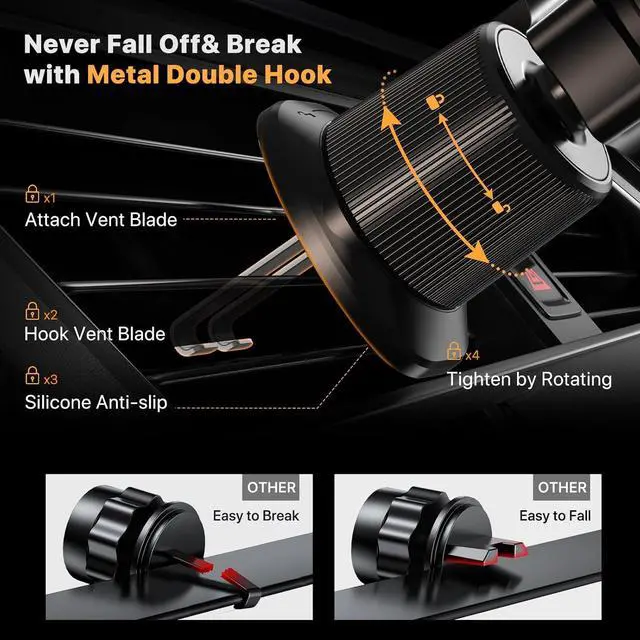 Upgraded Vent Clip-2nd Generation: We greatly improved our car phone mount based on the feedback from over 100, 000 customers. Upgrade its material and structure to make this vent phone holder much more stable and stronger, can hold the phone more securely,. This cell phone holder for car could work better for you even in extremely harsh environments.