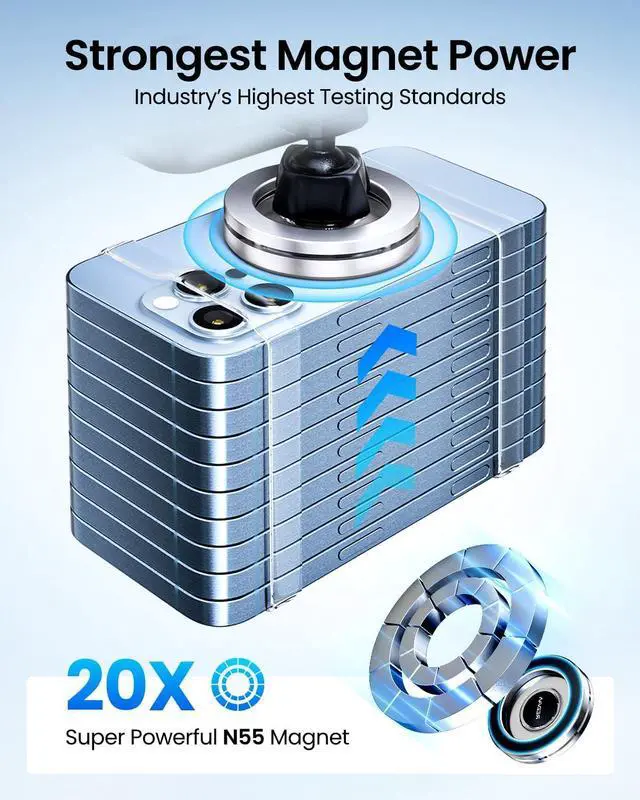 Built in 20 strong N55 magnets, the phone holder can hold up to 10 iPhone Pro Maxes. It keeps your phone securely in place, even on bumpy roads or sharp turns. Say goodbye to phone drops while driving