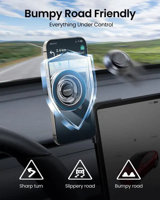 The REEVAA Tesla phone mount fit for Model Y 2020-2026, allows your phone to serve as an extended split-screen Tesla touchscreen. It ensures you can focus on the road while checking navigation, making it essential for daily commutes and long trips. Enhances your driving experience