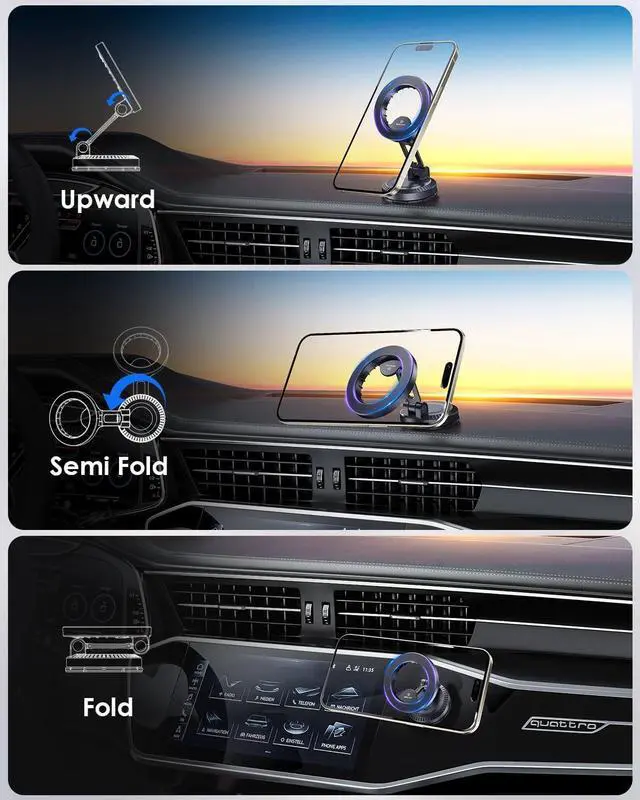 Foldable Design: Our magsafe car mount features a convenient foldable design, making it easy to store when not in use. This magnetic phone holder for car is compact, saving space on your dashboard.