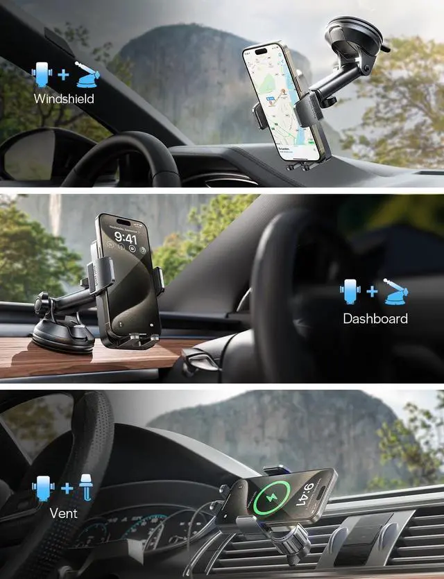 What you get? LISEN 3-in-1 car phone holder. This cell phone car mount has a total of two bases, one is suction cup, one is air vent hook clip, to meet your needs for different positions. The car phone holder can be mounted on the dashboard, air vents, windshield, anywhere you want. It is your excellent choice of car phone holder! You will get convenience and variety at the same time!