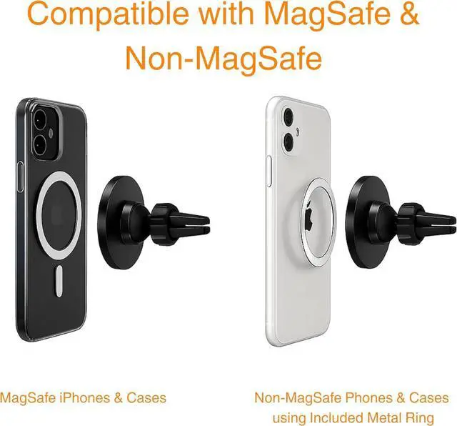 Secure Magnetic Hold, MagSafe-Ready Strong N52 neodymium magnets lock your phone securely in place; works with MagSafe iPhones and includes a metal ring sticker to add compatibility to non-MagSafe phones and cases.