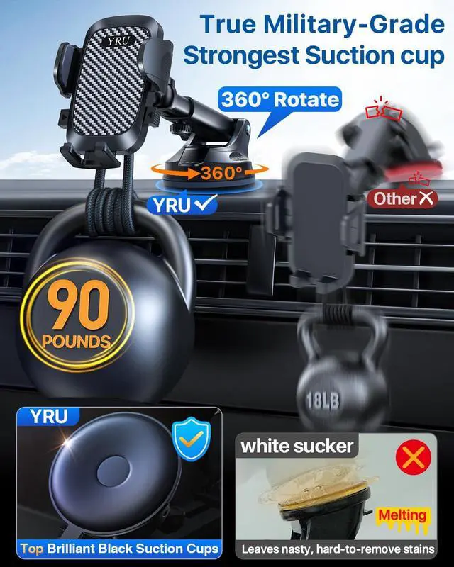 True Military-Grade Certified, 2025 Ultimate Car MountSince 2010, YRU has been devoted to R&D High-end Car Mounts. Over the past 15 years, we listened to millions of users' voices, and rigorously tested to MILITARY GRADE Standards (stability, compatibility, flexibility, security, durability, ease of use). Finally, we made this BEST Version in every aspect. Certified by