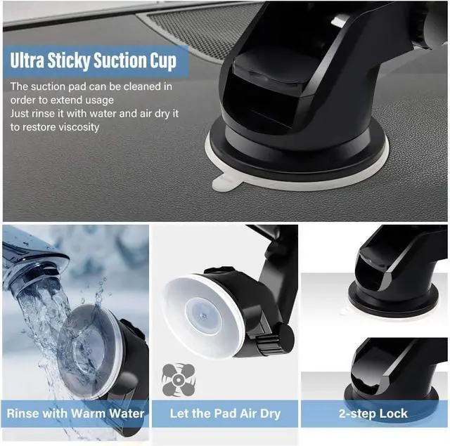 STRONG SUCTION: The viscous nano-silicone pad provides strong adhesion, ensuring that the phone and stand are securely mounted on the dashboard or windshield while you are driving. Simply rinse the suction with warm water and allow it to air dry. The ultra-strong suction cup can be reconditioned back to its original form