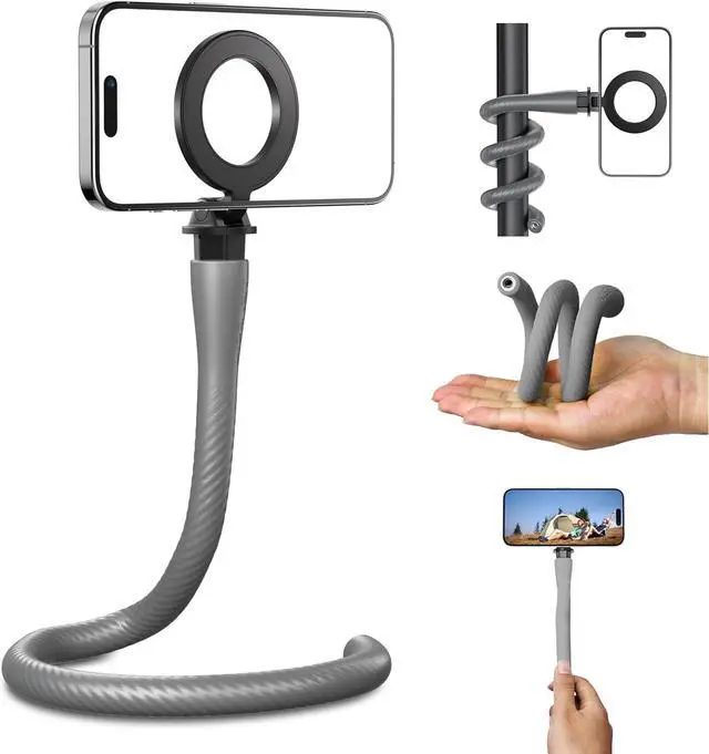 • Freely bendable, Effortlessly TwistedThis magnetic phone tripod stand for iphone has a built-in flexible aluminum strip that can be deformed at will (the built-in aluminum strip is highly extendable and features a non-slip surface for enhanced grip), so you can easily wrap this flexible phone holder around a variety of objects like metal poles, grocery shopping cart, tree, chair, etc. In short, it frees up your hands for multi-scene shooting.