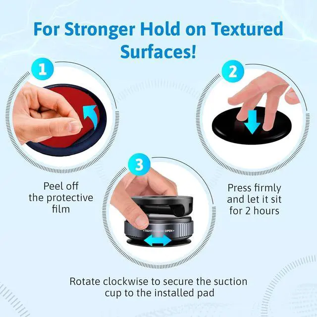 ?????????????????????????????????????????? Features a strengthened vacuum suction cup with a manual twist-lock mechanism for extreme grip. Stays secure even on bumpy roads. Quick-release design leaves no residue. For best results use the included adhesive pad on smooth textured surfaces. Avoid uneven or fluctuating surfaces.?????????????????????????????????????????????????????????? Works on windshields dashboards glass ceramic tiles acrylic polished metal and smooth painted walls.