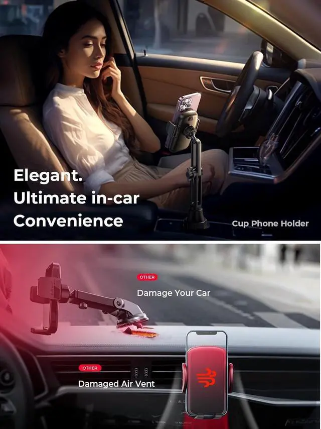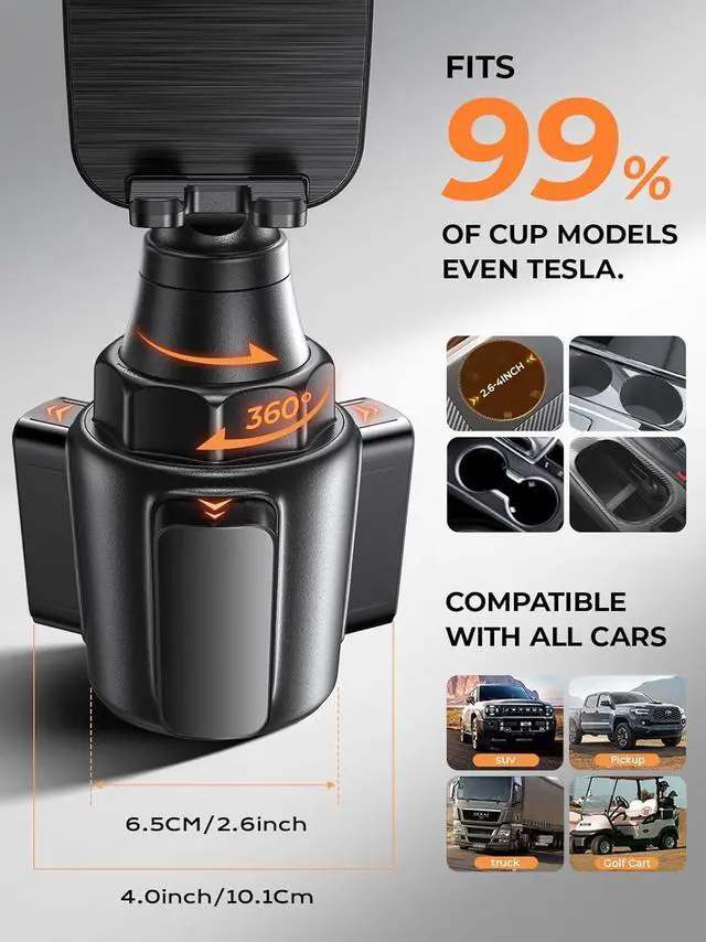 CUP HOLDERS: Our Cup Phone Holder for Car is compatible with 3- 4.6 inch Car Cup Holder (unlike others on the market that only support 3-4 inches) fitting almost all cars Bmw Ford Toyota Trucks and even golf carts. The super stable base featuring three protruding extension structures and non-slip silicone forms a triangular locking structure to prevent popping out ensuring a perfect and steady fit.