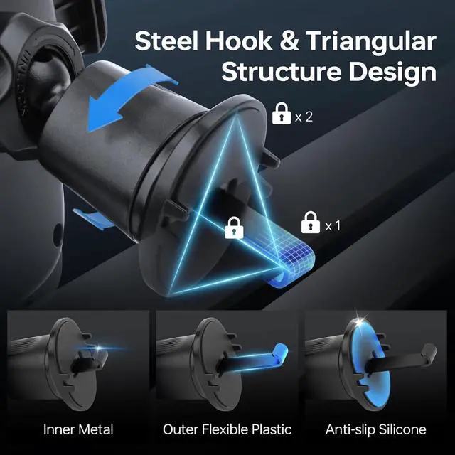Grip Technology: The reinforced metal hook and silicone-padded jaws create three contact points for maximum stability keeping your phone secure even on rough roads while preventing vent damage. Unlike flimsy competitors it won't sag or slip during daily commutesOne-Second
