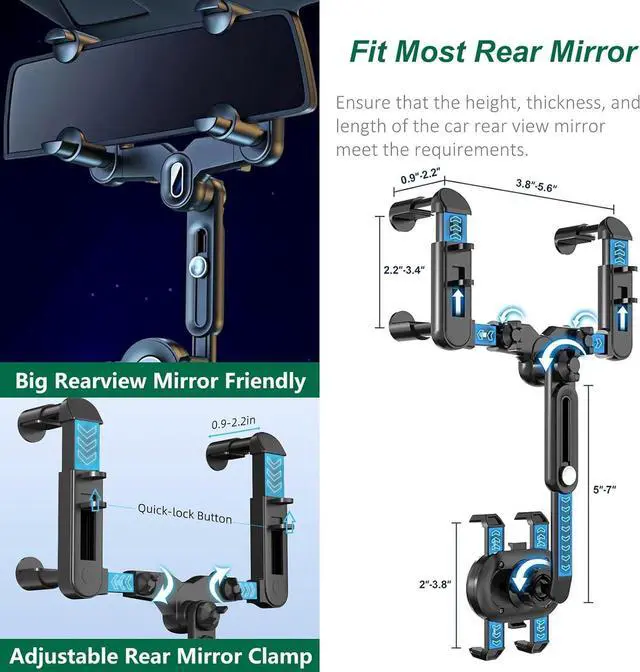 Upgraded Phone Holder for Carthe car phone holder is mounted on car's rearview mirror and can be freely adjusted to keep your eyes on road. With it you never need to look down at the navigation and can enjoy the more comfortable and safer driving experience. You or other one at the co-pilot can use the cell phone car holder to navigate watch video make video call live stream record video record driving record. The simple but creative design brings you the new using experience. Flexoble and AdjustableNew version multifunctional rearview mirror phone holder adopts a 360°rotating structure Switch between horizontal and vertical screens at will.