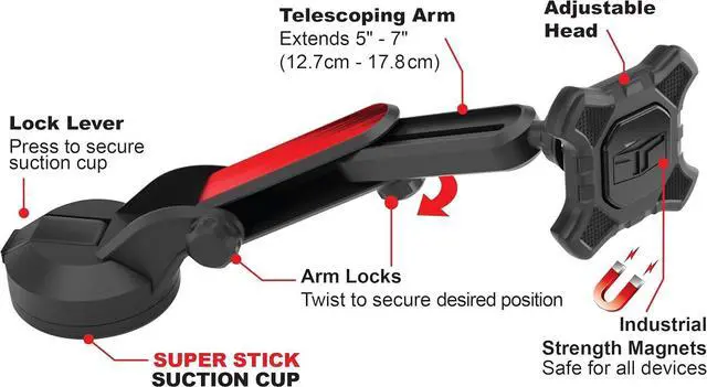 Phone Mount: Adjustable arm with 360 degree rotation and a full 6 inch extension ensures optimal placement in your vehicle. Features rubberized magnetic pads for securityPhone Holders and