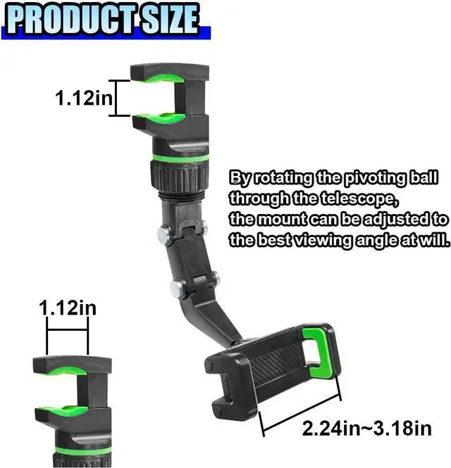 Rotation: The rearview mirror phone mount features a 360° rotation function and can switch between horizontal and vertical screen modes according to personal usage habits and actual needs allowing you easily to adjust to the most ideal angle. Moreover the arm length can be extended and retracted within and its ingenious design ensures that it will not block your line of sight. No More Looking Down at the