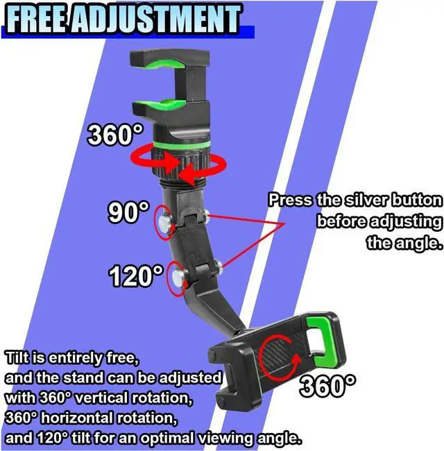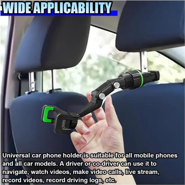 Wide Application: The phone mount for a car is compatible with various mobile phones with 3.5 - 7.2 inches is very suitable for installation on car rearview mirrors and seat headrest rods and can be used for navigation video calls and recording driving records can also be clamped in places such as the kitchen dining table and desk for watching videos live broadcasts recording videos etc. meeting the usage needs of multiple scenarios.