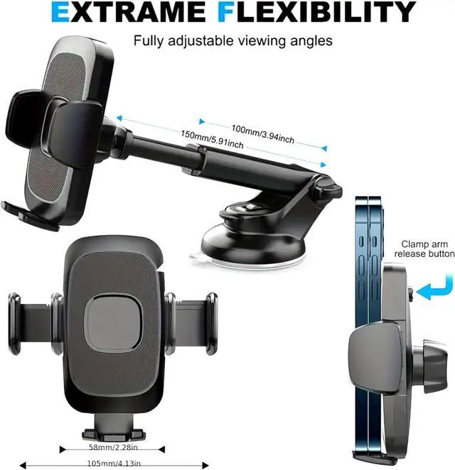 Reach: The enhanced 5.9 -inch mechanical flexible arm offers easy adjustability with a full 270° range. With 360° rotatable universal ball head you can adjust your phone to the most convenient position and angle for you so you can operate your phone comfortably and easily while driving. Versatile