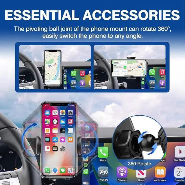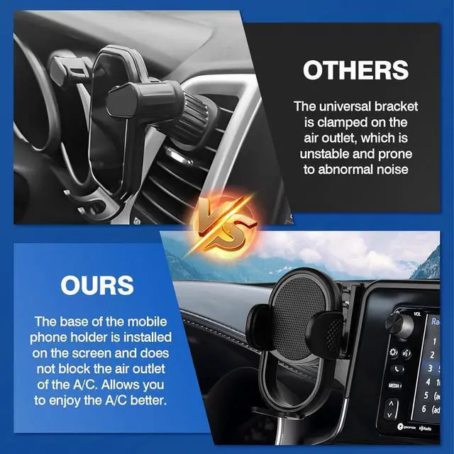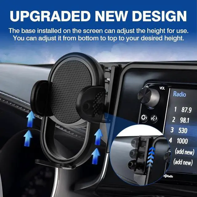 The pivoting ball joint of the phone mount can rotate 360 degree easily switch the phone to any anglePremium Material---The phone holder mount is made of high-grade ABS material which not only improves the quality but also guarantees the beauty. Super durable and firm. The flat edges and smooth surface make it look like an OEM partSimple Installation---No drilling or any tools required. Simply attach the screen bracket to the touchscreen and then attach the phone stabilizer to the screen base to complete the installation