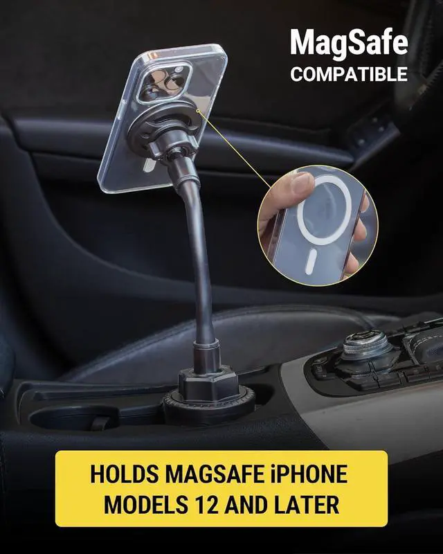 MagSafe: The built-in MagSafe magnets on the Scosche magnetic car mount provide a secure hold for iPhone 16/15/14/13/12/Pro/Max/Plus/Mini Magsafe Case and accessories. iPhone X 11 SE and Android phones can use the included MagicRing Adapter for MagSafe compatibility with this phone cup holder for carEasy and