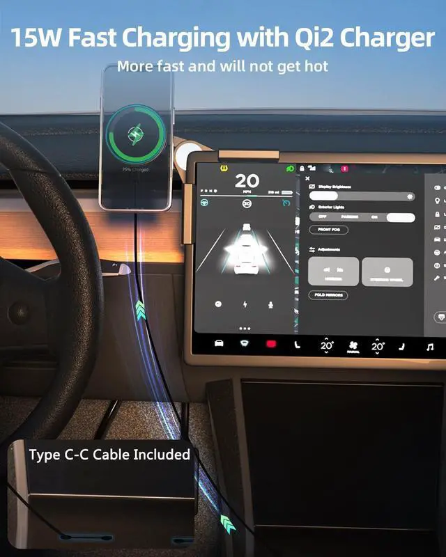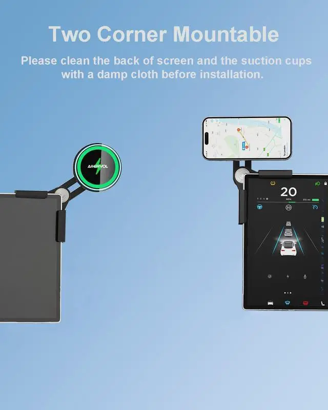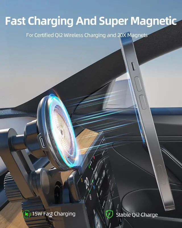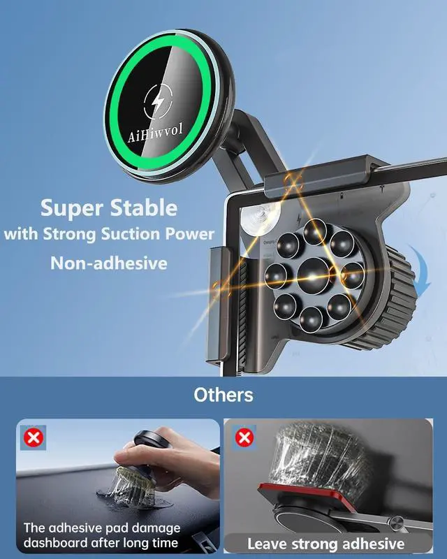 15W Fast Charging with Heat Restriction ChargingAiHiwvol for Tesla phone mount charger using the new for Qi2 wireless charging technology automatic alignment for your phone and achieves true 15W fast charging get more stable charging without interfere with wireless signals. The charger has heat restriction system and 24 Cooling holes design your phone will not get too hot even long time charging and it will automatically stop charging when fully charged. No Glue Required with Strong Suction CupsThe adhesive glue will leave stains that are difficult to remove and may damage your tesla screen so keep far away from adhesive.
