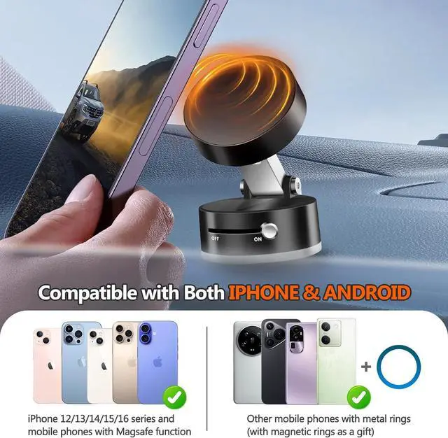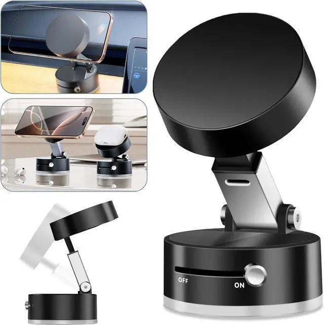 Double-Sided Design & Versatile MountingExperience dual functionality with a vacuum suction side for smooth surfaces and a magnetic side for quick phone attachment ensuring a stable grip without residue even on dusty or uneven textures. Strong Magnet & Foldable StructureN52-grade magnets paired with a collapsible frame deliver robust phone security during sudden stops while the 360° adjustable arm offers optimal viewing angles for driving workouts or video calls. Universal Compatibility & Metal RingSupports iPhone 16/15/14/13/12 Pro/Max/Mini and Android devices via included metal ring for non-magnetic cases 24-hour curing ensures maximum adhesion strength. Multi-Surface & Multi-Scene UseSecurely adheres to car dashboards mirrors tiles glass and gym equipmentideal for navigation cooking tutorials fitness tracking or social media streaming.