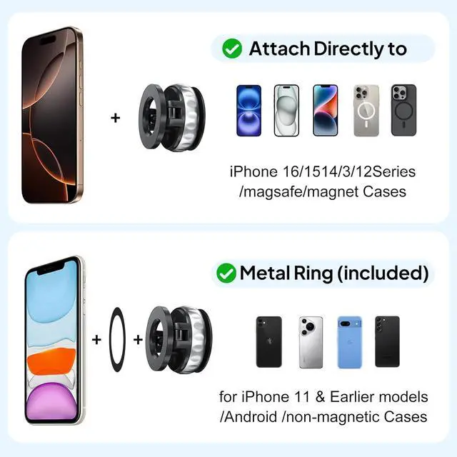 Wide Compatibility: Our phone mount for car compatible with iPhone 16/15/14/13/12 and Pro Max mini-series. In addition we offer metal rings for non-magnetic phones and phone cases. Glue the metal ring to the back of the phone Compatible with iPhone Android and All Smartphones.