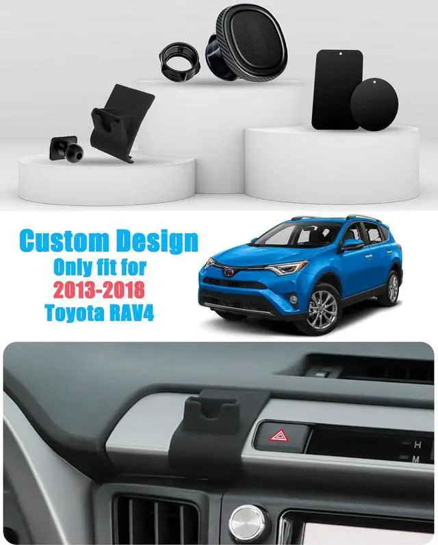 ONLY FIT FORMagnetic car phone holder fit for Toyota RAV4 2013 2014 2015 2016 2017 2018. Apply to most 4-7 inches phones. But if your phone with a large screen size is equipped with a phone case that is too thick and too big not fit. CUSTOM MADE HOLDERPhone Mount is the best option for the Toyota RAV4. If you own Toyota RAV4 you know there isn't a lot of place to mount your phone. This is an ingenious way to do it. Snaps into place with no adhesive or suction cups and the placement is perfect.