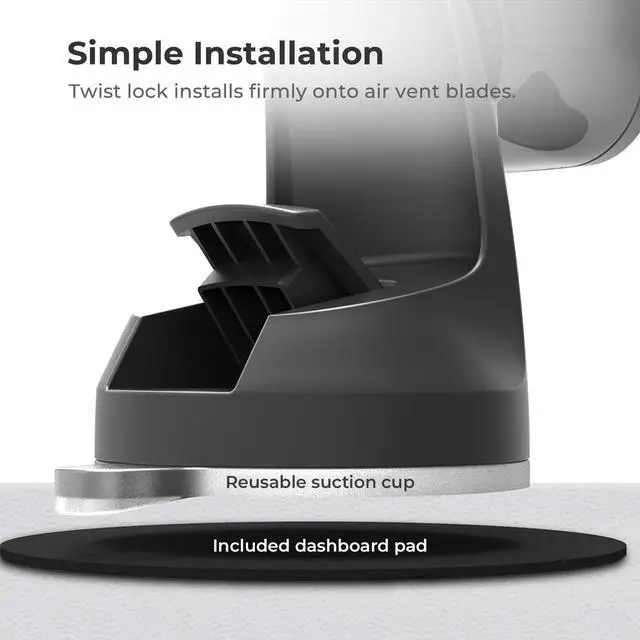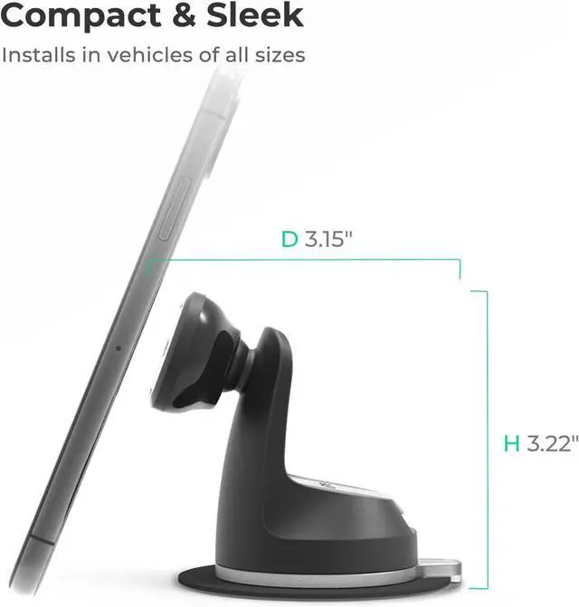 DASHBOARD PAD AND SUCTION CUP: Includes a suction cup base and a semi-permanent dashboard pad that attaches directly to the dashboard for a secure hold. NOT COMPATIBLE with MagSafe.