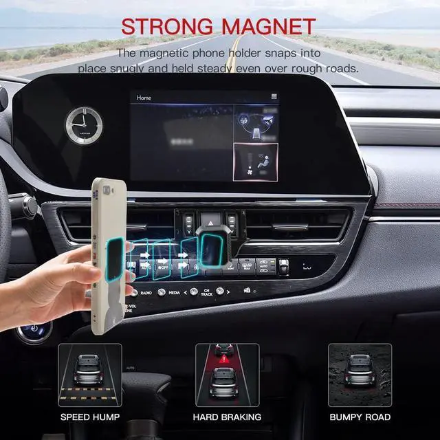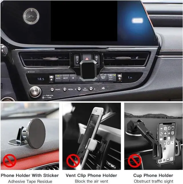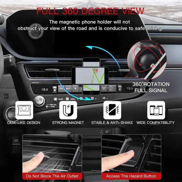 SUPERB FIT - Looks almost like an OEM product as it is custom fit for Lexus ES 2022. HIGH QUALITY - Made of premium ABS and CNC polished aluminum alloy. Doesn't block the air vents and you can access the hazard button. The phone mount fit for Lexus ES 2022 is perfect for facetime calls and GPS navigation. POWERFUL MAGNET - The powerful magnet plate attached to the car phone mount fit for Lexus ES ensures that the magnetic phone holder snaps into place snugly and hold your phone firmly even in sharp turns and hard braking.