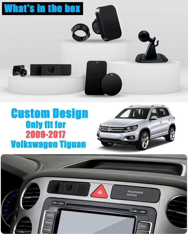 ONLY FIT FORMagnetic car phone holder fit for Volkswagen Tiguan 2009 2010 2011 2012 2013 2014 2015 2016 2017. Apply to most 4-7 inches phones. But if your phone with a large screen size is equipped with a phone case that is too thick and too big not fit. CUSTOM MADE HOLDERPhone Mount is the best option for the Volkswagen Tiguan. If you own Volkswagen Tiguan you know there isn't a lot of place to mount your phone. This is an ingenious way to do it. Snaps into place with no adhesive or suction cups and the placement is perfect.