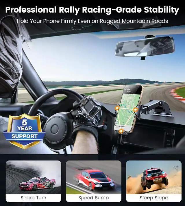 [Professional Rally Racing-Grade Stability] Even professional racers are amazed by its stability, because of its strong stability, this car mount has become the WRPG (World Rally Grand Prix) only designated product. this car cell phone holder owns the thick arms built-in anti-slip rubber pads, and full upgraded powerful suction cup, even you hit a bump or a sharper turn car phone holder and your phone will stay in a place.