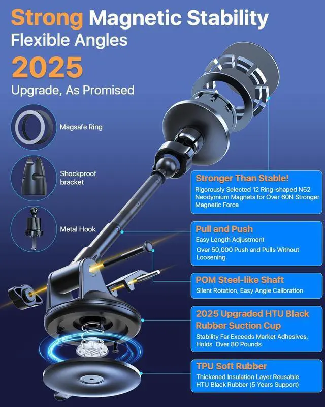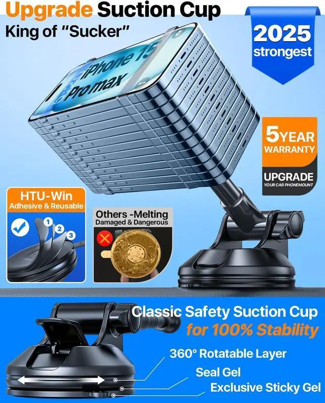 [2025 Original Design, Magnetic Holder Expert Compatible for Magsafe] Optimizing 17 models and testing 156 kinds of material. HTU R&D team designs the [Strong Magnet, 360° Rotatable & Alloy Suction Cup ] windshield dashboard magnetic car phone mount for MagSafe. Industry-only made of Solid Aluminum Alloy & KING of Plastic is certified by CE, RoHS, CP65