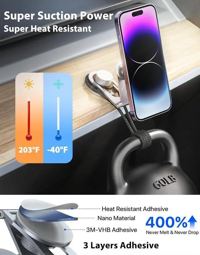 [Superior Heat Resistance] Equipped with 3M' s top-tier heat-resistant materials and advanced adhesive technology, ensures unparalleled durability in high-temperature conditions. Even in extreme environments ranging from -40°F to 194°F, this iPhone car mount securely adheres to the car dashboard/touchscreen.