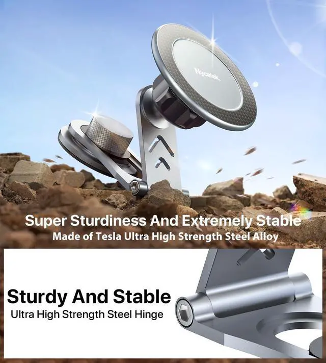 [Top Sturdiness and Durability] Nycetek magnetic phone holder made of the same ultra-high strength steel aluminum alloy as Tesla cars for optimal durability. Strong hinge like tesla frame, mimicking the steadfastness of a tesla chassis. Provides optimal stability for your phone.
