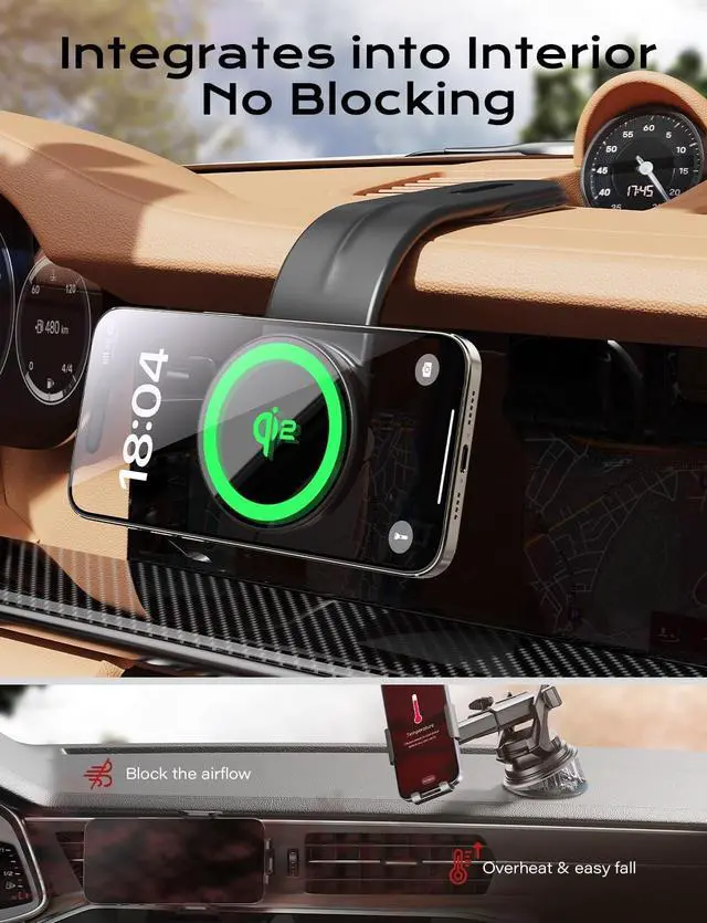WIRELESS FAST CHARGING: This fit magsafe car mount charger is equipped with the original 15W turbo fast charging, which can charge the phone from 0 to 55% in as fast as 30 minutes. When you use the navigation on your phone while driving, this fit magsafe car charger will fully charge your phone seamlessly and always keep it powerful. Combined with the AI temperature control chip, the phone can be charged calmly and keep great battery health.