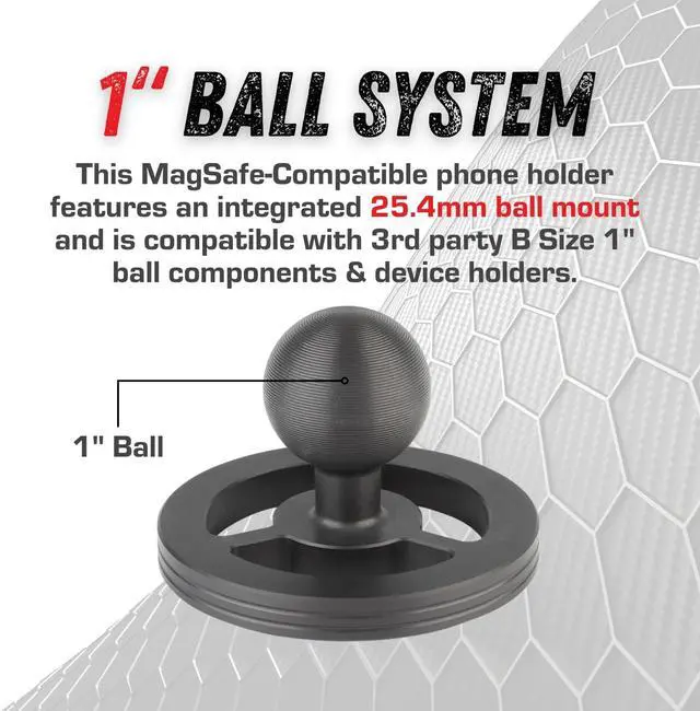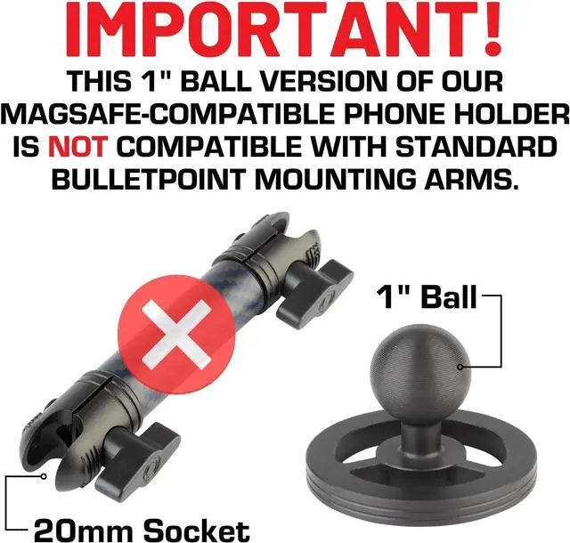 [1 INCH BALL PHONE HOLDER] on the back side of the phone holder is an integrated 1 inch ( 25.4 mm) mounting ball which attaches to any 3rd party B Size mounting arm with 1 inch sockets. Does NOT fit standard Bulletpoint mounting arms. *Patent Pending*