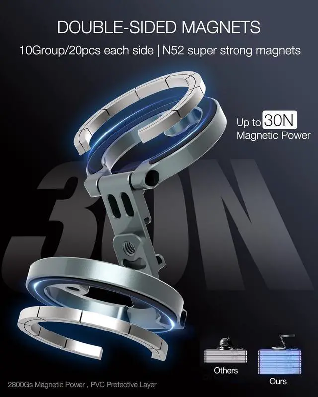 MG-02 Double Magnetic Ring Mount Dual side magnet rings powers 2800Gs, can withstand a weight of up to 30N/6LB+, equivalent to the weight of 10 iPhone 15 Pro Max devices. Ensures a stable phone-holding solution with its magnetic design, a must-have accessory for truck, lorry, tractor, forklift, boat and motor vehicles, also it can stick on gym equipment, refrigerator, metal fire door, metal rack, metal shelf, magnetic and other metal surfaces etc