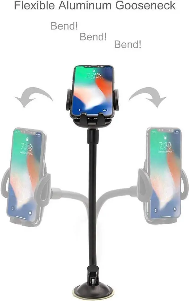 [Long Arm with Flexible Base]---An extra lengthen thick al pipe together with flexible base makes you could touch your devices more easily, especially useful for windscreen and unevenness dashboard