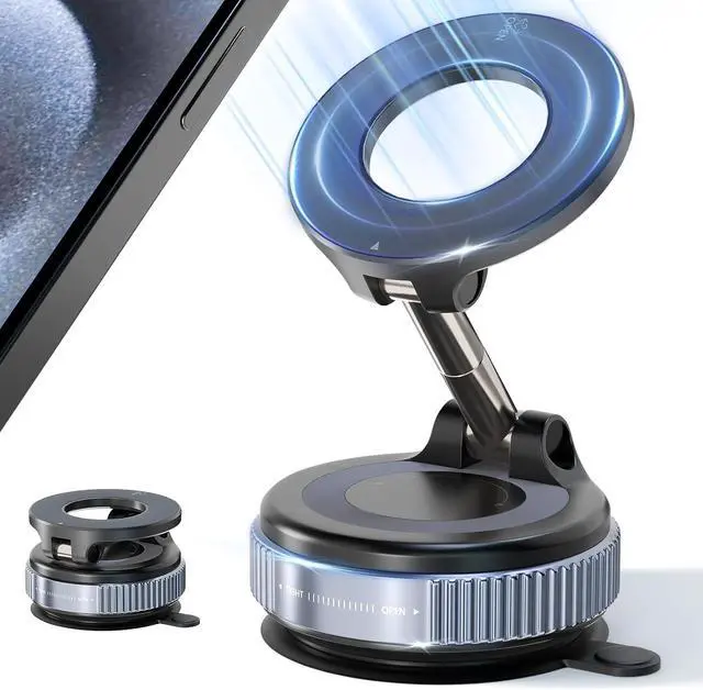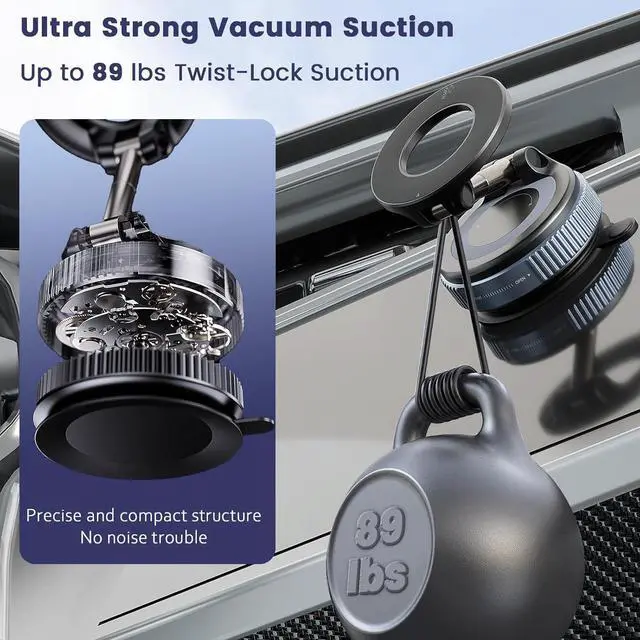 Vacuum Suction Cup and Twist-lock mechanism: Magnetic suction phone mount features an enhanced vacuum suction cup design with a twist-lock mechanism to provide stronger physical suction while driving. Unlike traditional adhesive holders, this design not only increases suction by 50%, but also allows for easy repositioning without leaving any residue. In particular, vibrations and shakes during driving will enhance the suction of the suction cup, ensuring that the phone remains stable on bumpy roads.