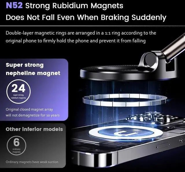Dual-coil N52 strong nepheline magnets: Vacuum magnetic phone stand adopts a dual-coil design and is equipped with 24 high-performance N52 magnets with a precise 1:1 circular pattern. The magnetic force is 240% stronger than standard magnets, providing up to 2800gf of magnetic force, even in unexpected situations such as sudden braking, it ensures a stable and firm connection between the phone and the bracket.
