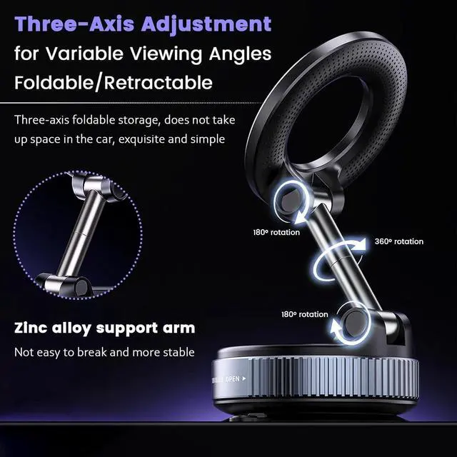 Three-Axis Stable Support: Vacuum magnetic phone holder features a three-axis stable design to ensure that the phone will not loosen when adjusting the angle. The 360° rotation function allows users to easily adjust the angle of the phone as needed, whether in landscape or portrait mode, you can find the best viewing angle. The innovative folding design reduces its size by 50% when not in use, ensuring that your car or workspace remains tidy.