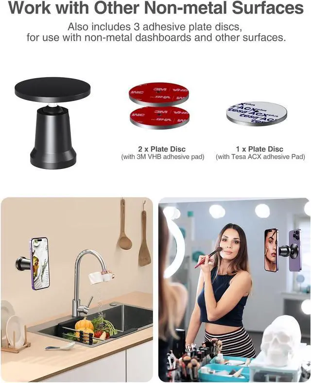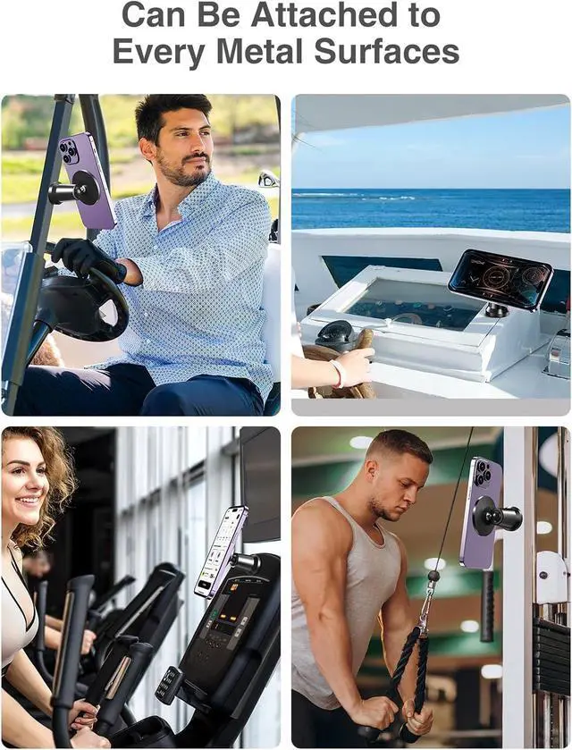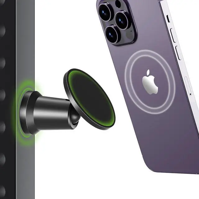 Dual Magnetic Gym Phone MountThanks to dual magnetic feature, you can easily attach this gym phone holder to any gym equipment, then automatically snap your iPhone to the phone holder by magsafe. This gym phone mount provides a hands-free solution for video watching, tracking progress, and following virtual training sessions. No more fumbling with your phone or trying to balance it on a machine. Moreover, three extra adhesive steel discs inside for any other non-metal surfaces.