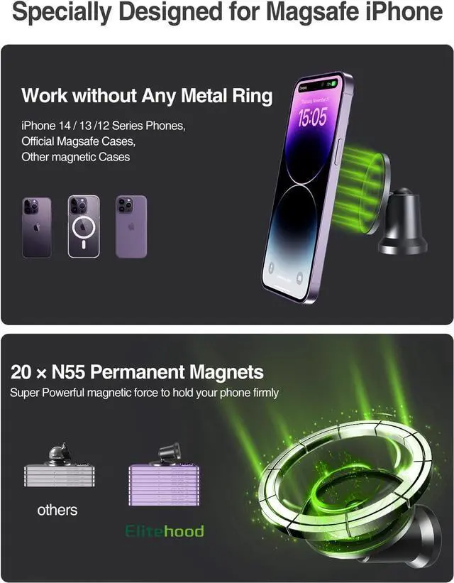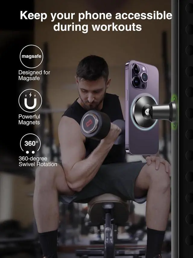 Designed for Magsafe PreciselyThis gym phone holder accessories is specially designed to seamlessly fit for Magsafe iPhone 15 14 13 12 Pro Max Mini & Magsafe Cases. Without the need of additional sticking magnet plates, just get close and automatically snap your iPhone to the gym magnetic phone mount. The best gift for someone work out in gym (Note: If you are using a non-Magsafe phone or case, you have to stick the included adhesive metal ring on the back of other boxes or phone to make it
