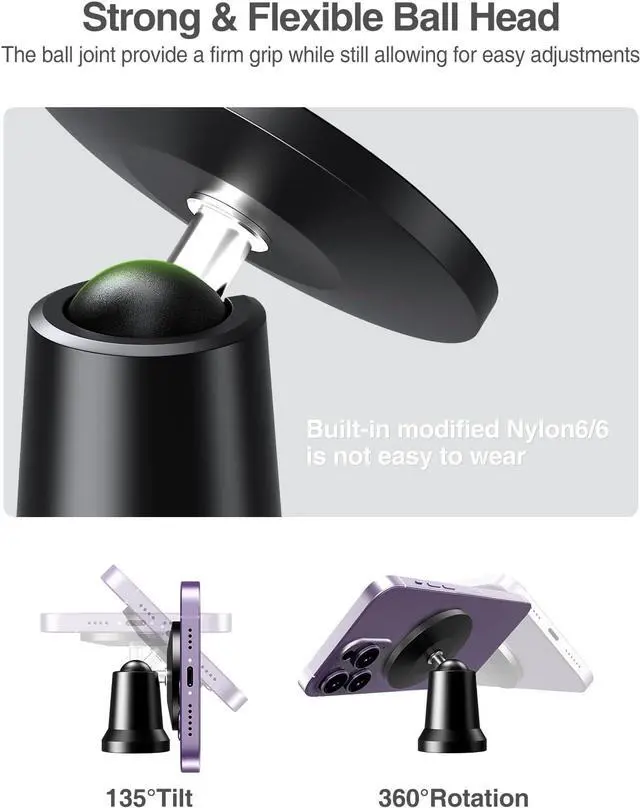 360-degree Angle AdjustableThe gym magnetic phone holder supports 360-degree rotation/swivel and 90-degree tilt angle adjustment, you can easily position your devices at the perfect angle for optimal viewing, whether youre on the treadmill, lifting weights, or doing yoga. Also the metal ball built is with wear-resistant Nylon6 to increase friction so that it can withstand a heavy phone easily and has less wear and aging.