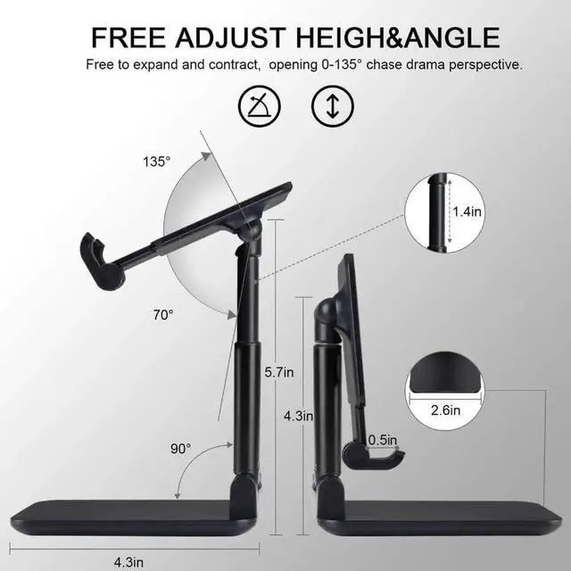 The angle of the universal phone stand can be adjusted from vertical to horizontal(0°-90°), and height can be extended up to 4.5 inches, which allows you to get most comfortable viewing posture. A good helper desktop accessory that frees your hands to watch videos, have online class, do live stream and so on.