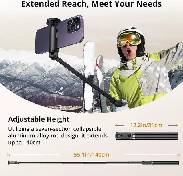 Convenient to Carry, Free Expansion The ATUMTEK Bluetooth Selfie Stick weighs only 350 grams, and due to the hidden extendable design, it is only 12.2 inch/31cm in size when collapsed and can be extended to a maximum of 55inch/140cm, allowing you to conveniently store it in your backpack. You can use the selfie stick at any time to capture beautiful moments.