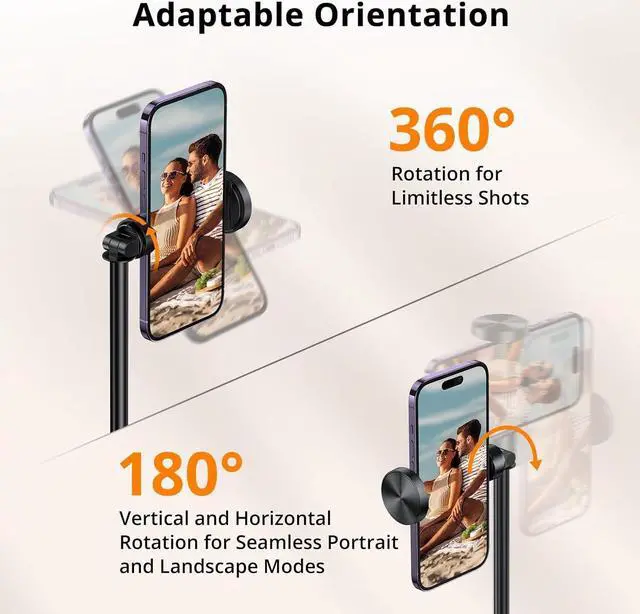 Highly Compatible and 360° Rotatable With a phone clamp range of 2.12 inch/54mm to 3.62 inch/92mm and non-slip silicone pads, our phone tripod is compatible with all smartphones and ensures a secure grip without causing damage. Our phone tripod offers angle flexibility with 360-degree rotation and 180-degree tilt, allowing for easy adjustment to find the best frame.