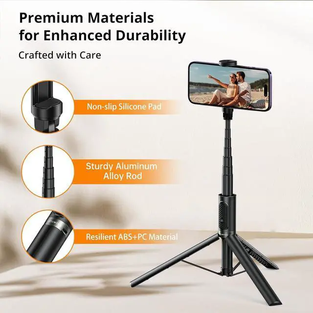 Fully Shockproof Upgraded Model The ATUMTEK Selfie Stick, tripod, and extendable pole are made of high-quality aluminum, with a housing made of black ABS+PC injection molding technology, connected to make it extremely stable and durable. The tripod base features a stable double triangular structure with extra-large coverage and non-slip silicone pads.