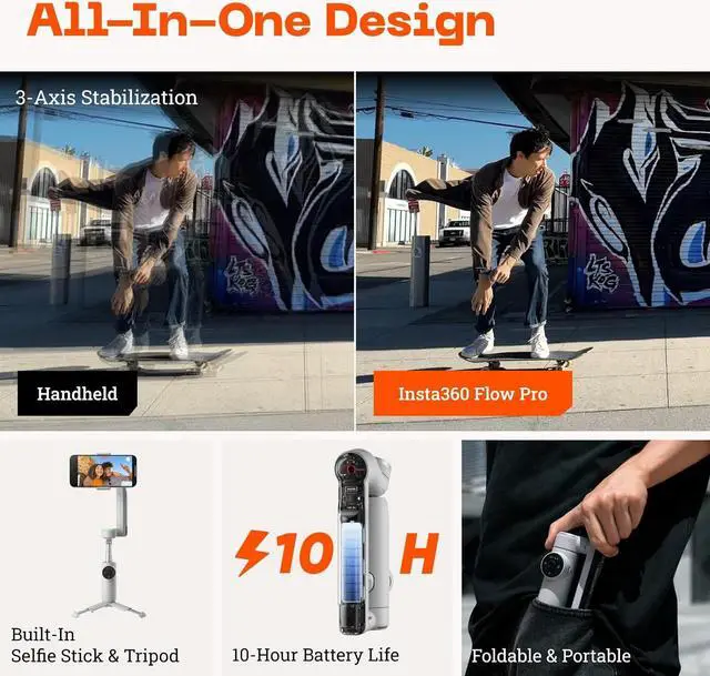 Portable & Foldable: With a compact design, it easily fits into your bag or pocket. Flow Pro then unfolds in a single motion, auto-balances, and auto powers on so you can get shooting faster.